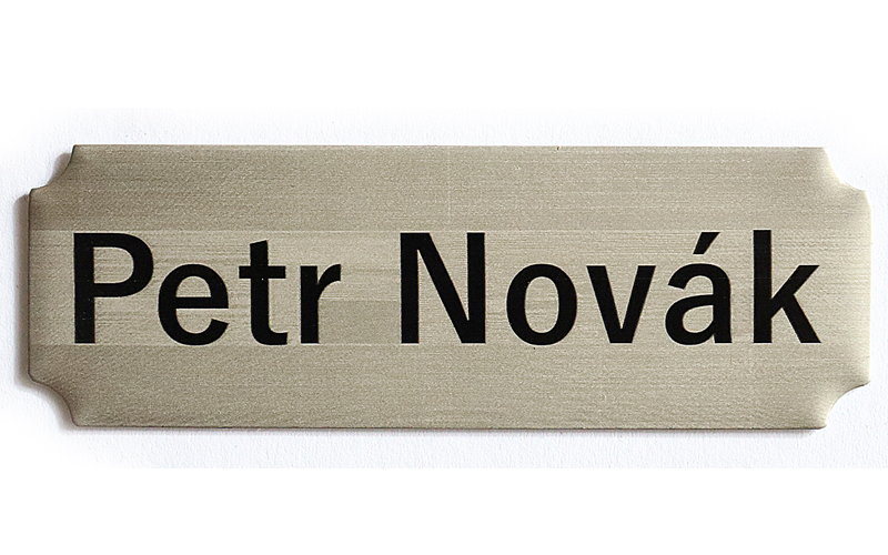 - Černá jmenovka se stříbrným gravírováním – moderní vzhled s kovovým efektem.