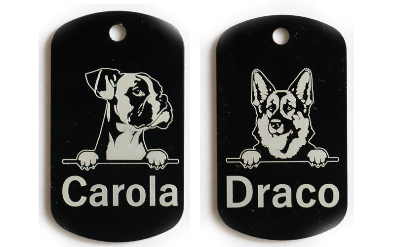 Lehčené psí známky s detailně propracovaným motivem. Oboustranný precizní gravír v ceně 185 Kč. Každá známka je trvalá, odolná vůči poškození i vodě a zároveň působí elegantně a originálně. Ideální volba pro všechny, kteří chtějí svému psovi dopřát stylový a nezaměnitelný doplněk s osobitým designem.